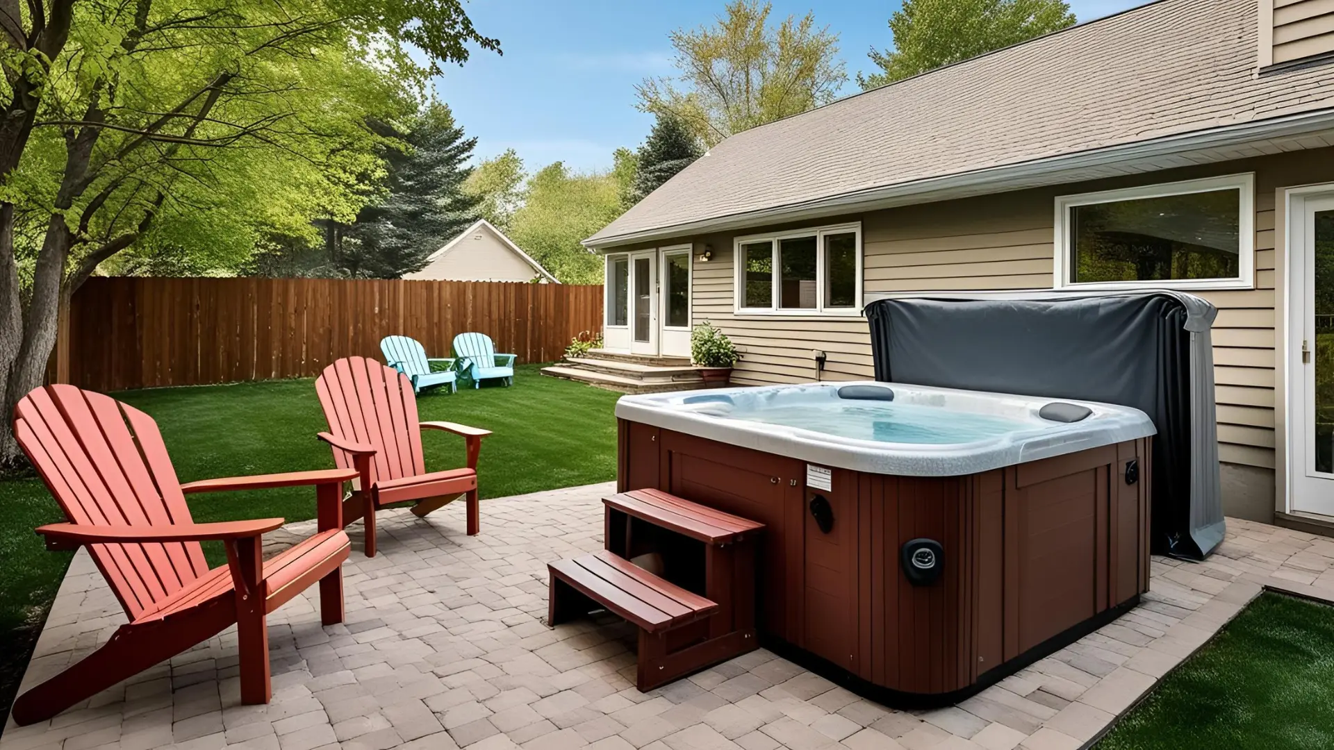 Adirondack chairs with colorful cushions and a side table, showcasing durable outdoor furniture designed for comfort and style in backyard settings.