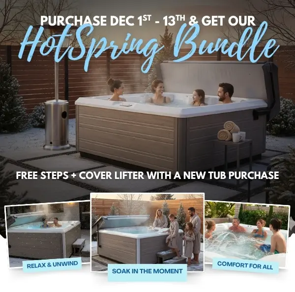 Enjoy more value with our HotSpring Bundle Sale, December 1–13. Buy a new HotSpring hot tub and receive FREE upgraded steps and a FREE cover lifter. A perfect upgrade for winter relaxation. Limited time only.